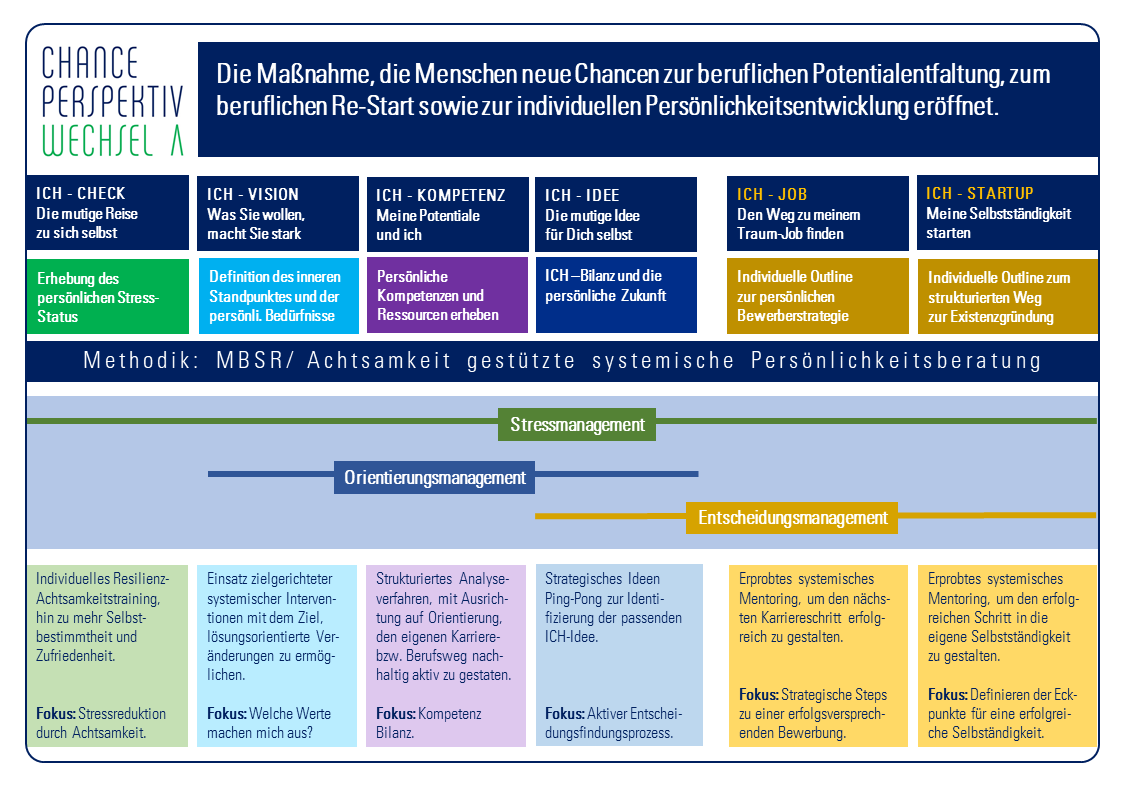 Chance-Perspektivwechsel möchte Ihnen, seinen Kundinnen und Kunden zur Seite stehen im Rahmen ihrer beruflichen und somit auch privaten Lebensplanung, mit den Zielen die passenden Orientierungs- und Entscheidungshilfen hinsichtlich ihrer zukünftigen Arbeitsgestaltung zu erhalten.